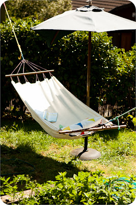 Lay in the hammock and read my Simplicity Parenting book. Utter bliss. Our umbrella is on it's very last legs and we didn't have the shade sails up so I made do with the half shade and a bit of green muslin (play cloth) to cover my feet.