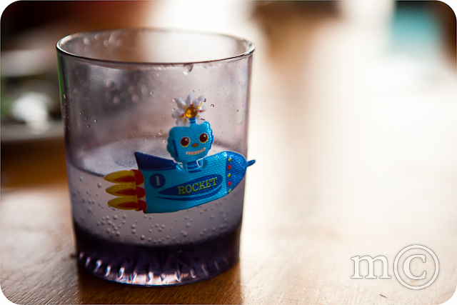 We decorated the house with some lamintated stars (old wrapping paper) and rocket ship pictures, put some puffy stickers on our drinking cups and chopped up a big cardboard tube to make stargazing telescopes.