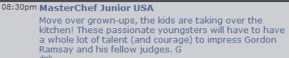 Starting tomorrow night on Prime TV... Masterchef Junior USA. We've watched the Aussie one before and it's great to see kids doing such amazing things in the kitchen. Thought I'd mention it here as it's been a great inspiration to the boys, maybe your kiddies would like it too.